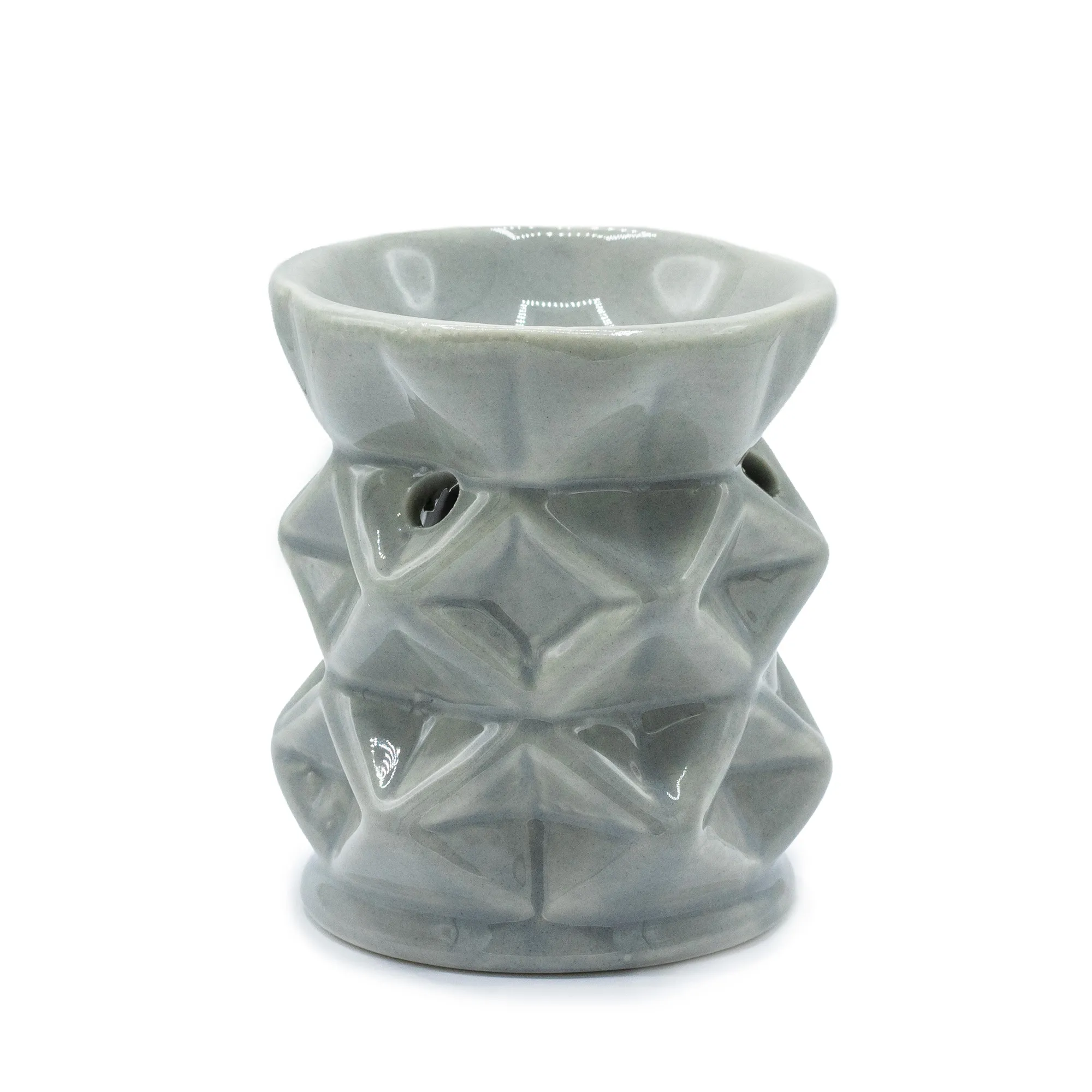 Geomeetriline aroomilamp hall — keraamika õlipõleti geomeetrilise läbilõikega. Neutraalne ja ajatu disain sobib igasse interjööri.