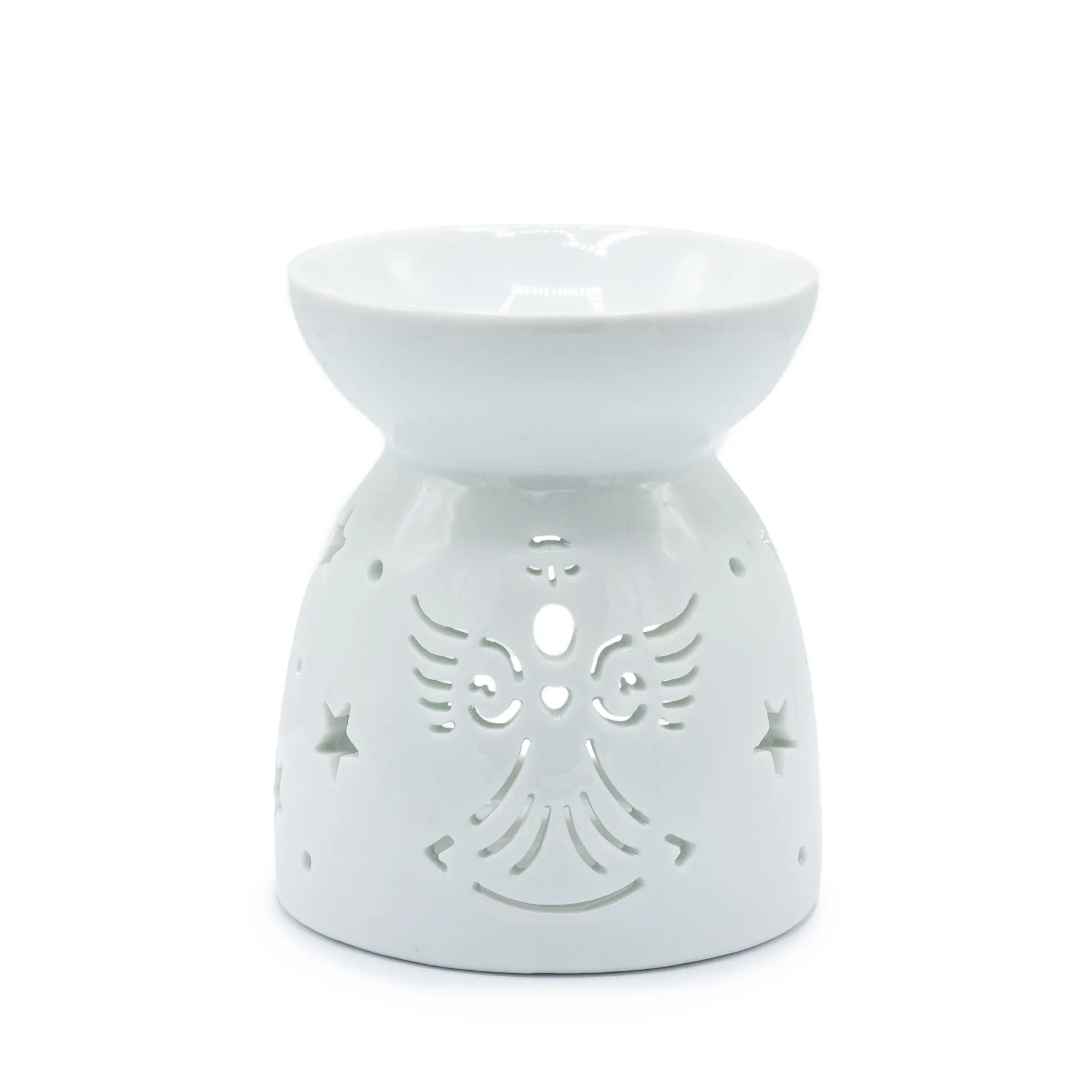 Ingli aroomilamp valge keraamika — õlipõleti ingli läbilõikega. Taevalik ja rahustav disain, küünlavalgus loob pehmet sooja valgust.