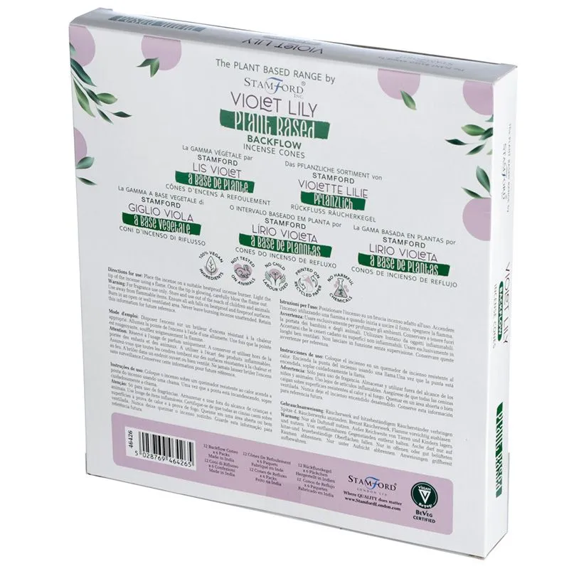 Stamford Premium taimsed backflow viirukikoonused on käsitsi rullitud looduslikest taimsetest materjalidest ja vaigust. Kõrgem lõhnaaine sisaldus tagab liilia aroomi rikkaliku ja kestva iseloomu. Iga koonus põleb umbes 30 minutit, pakkudes pidevalt kaunilt voolavat suitsuefekti.