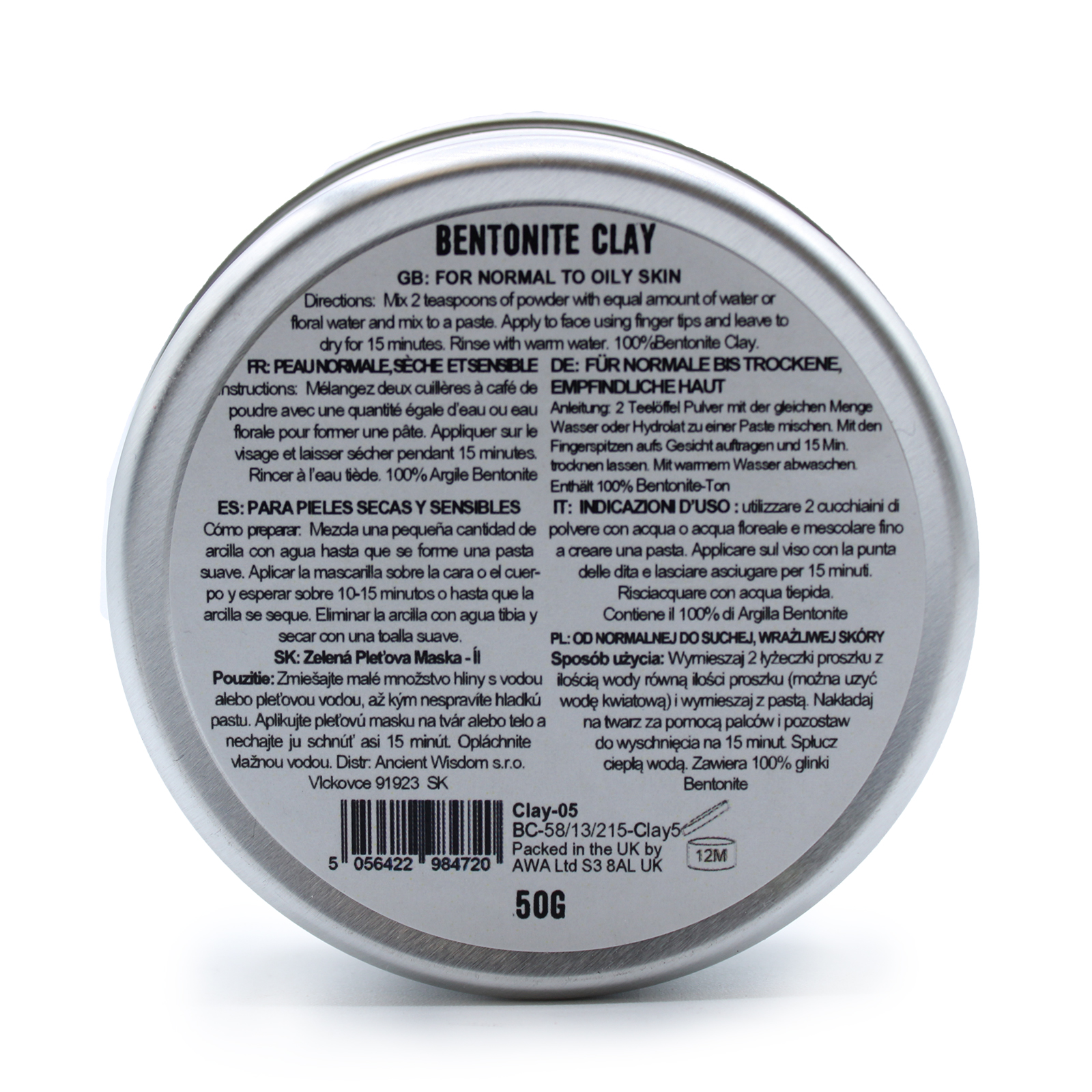 Ancient Wisdom bentoniitsavi on puhas ja kõrgekvaliteediline vulkaaniline savi. Lisa segule tilk õunaäädikat või sidrunimahla, et võimendada puhastusefekti. Sinu nahk tänab sind särava ja puhta jumega.