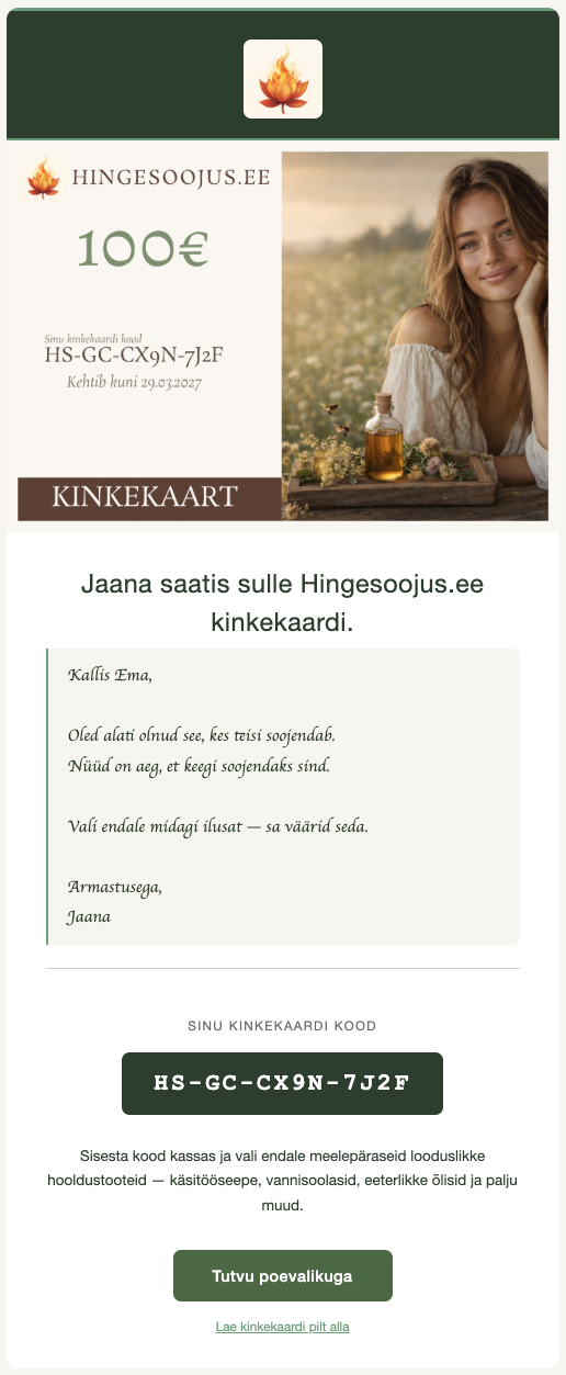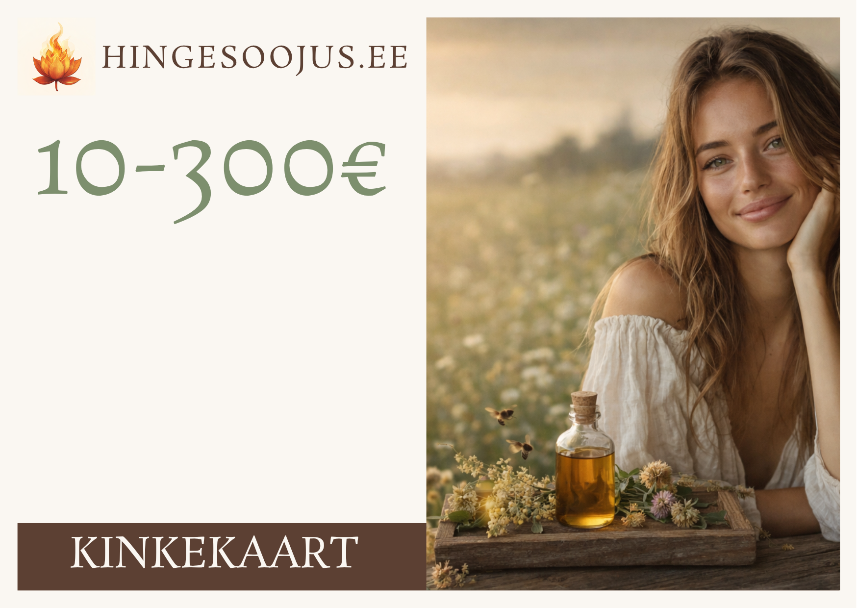 Hingesoojus.ee kinkekaart jõuab kohale kohe. Vali summa, lisa isiklik tervitus. Kehtib 12 kuud. Sobib kõigile looduslike