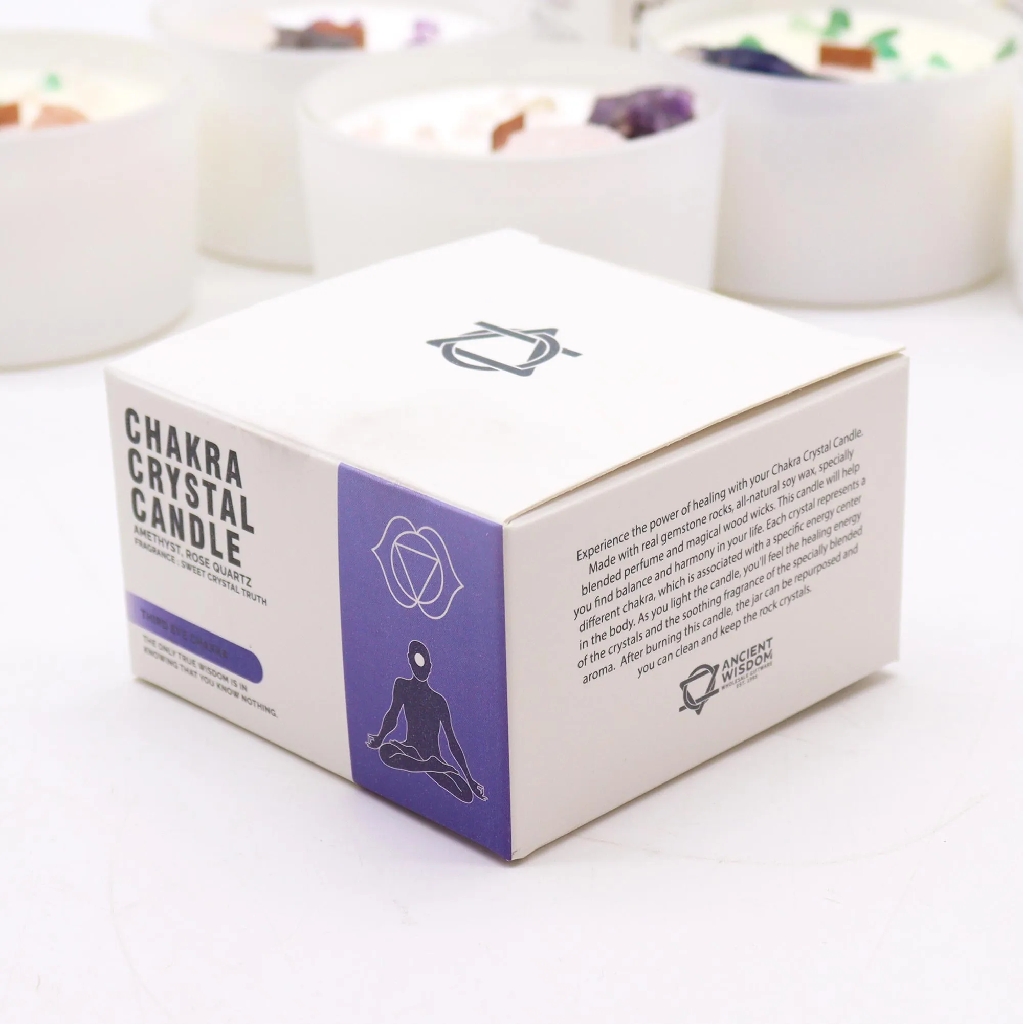 Kolmanda silma tsakra on sinu intuitsiooni ja sisemise tarkuse keskus. See kolmanda silma kristalliküünal on loodud laiendama sinu intuitsiooni ja süvendama teadlikkust. Küünla sees peituvad ametüst ja roosa kvarts — poolvääriskivid, mis toetavad vaimset selgust ja sügavat arusaamist.