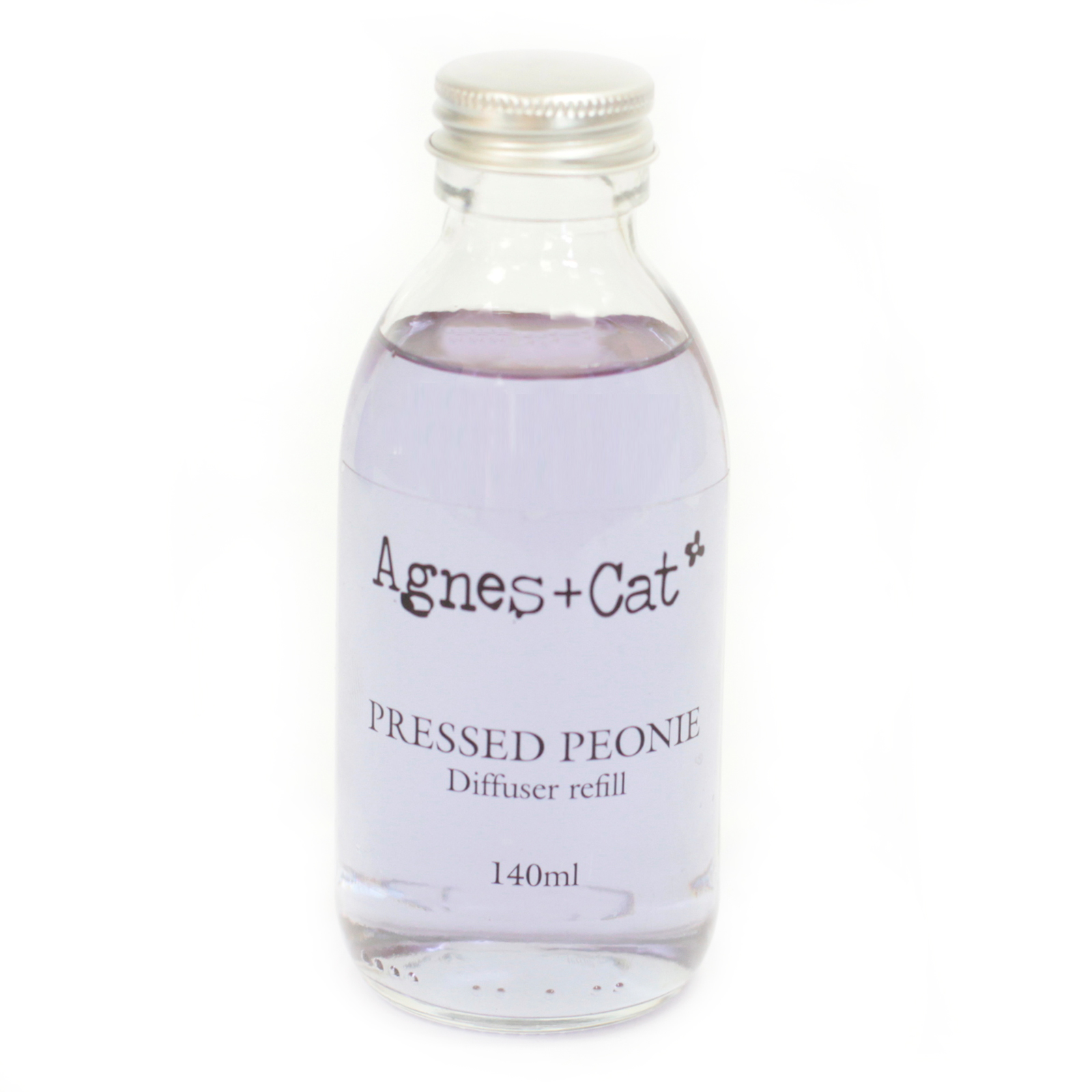 Pressed Peonies pojengi difuuseri täide 140 ml. Agnes + Cat pulkdifuuserile — romantiline pojengilillede aroom kestab vähemalt 3 kuud. Klaaspudel.