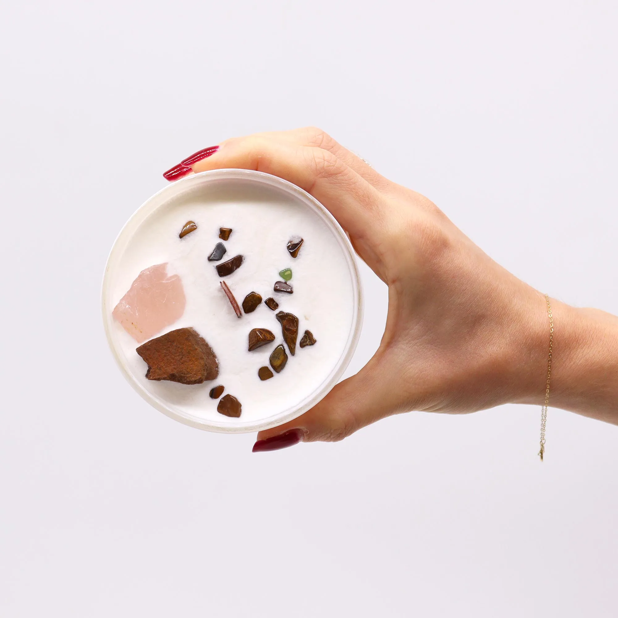 Karbil on kirjutatud: “Tulevik kuulub neile, kes julgevad unistada.” See on meeldetuletus, et sinu unistused väärivad tähelepanu ja tegutsemist. Pärast küünla põlemist saad klaaspurki taaskasutada ja kristallid endale alles hoida — nii kannavad poolvääriskivid oma energiat edasi ka igapäevaelus.