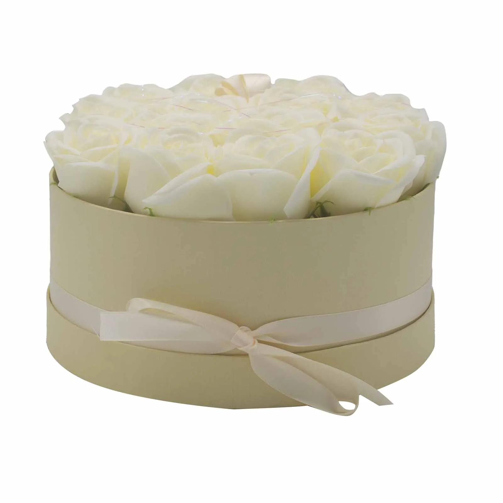 See seebililled kreemjas ümber on sarja suurim ja uhkeim kreemjas kinkekomplekt. Neliteist käsitsi vormitud kreemjat seebiroosi on paigutatud kaunisse ümmargusesse karpi, luues tõeliselt klassikalise ja muljetavaldava kingituse. Kreemjad roosid ümmarguses karbis meenutavad elegantset lillekimpu, mis ei närtsi kunagi.