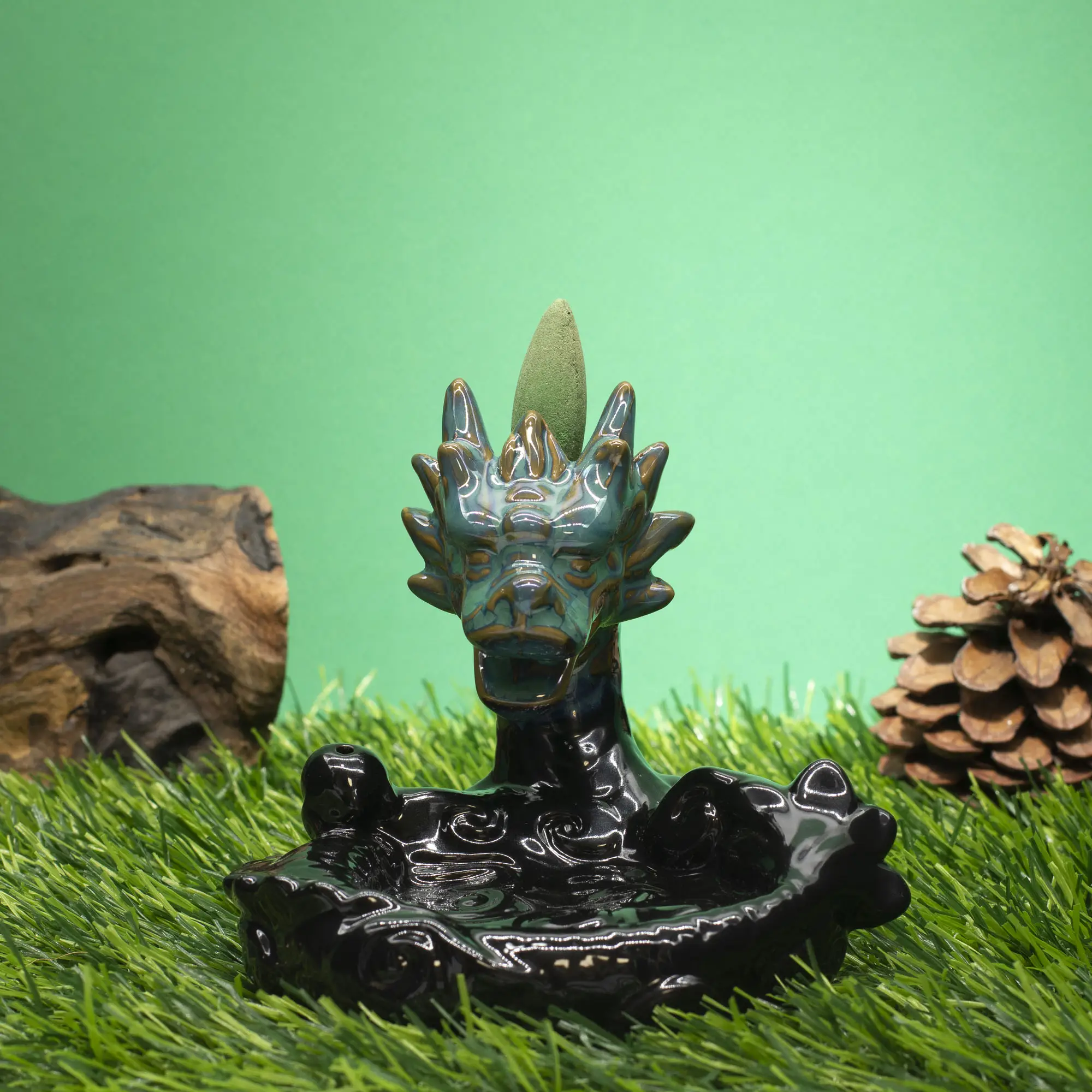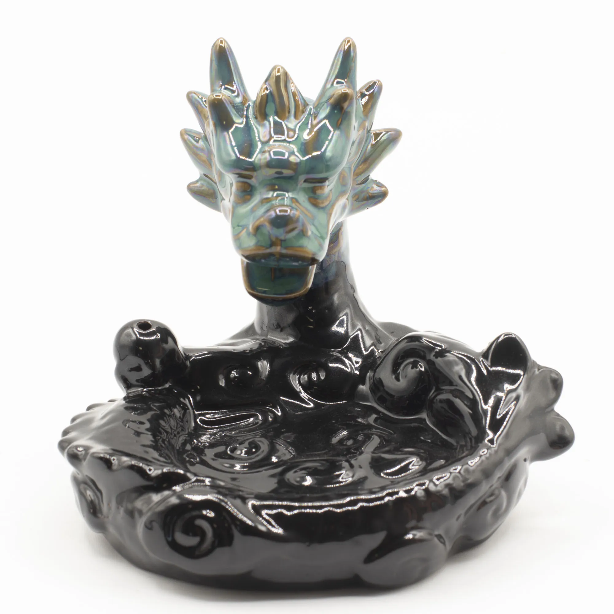 Suur draakonipõleti draakoni pea ja laia basseiniga loob muljetavaldava suitsuefekti. Glasuuritud keraamikast backflow viirukialus.