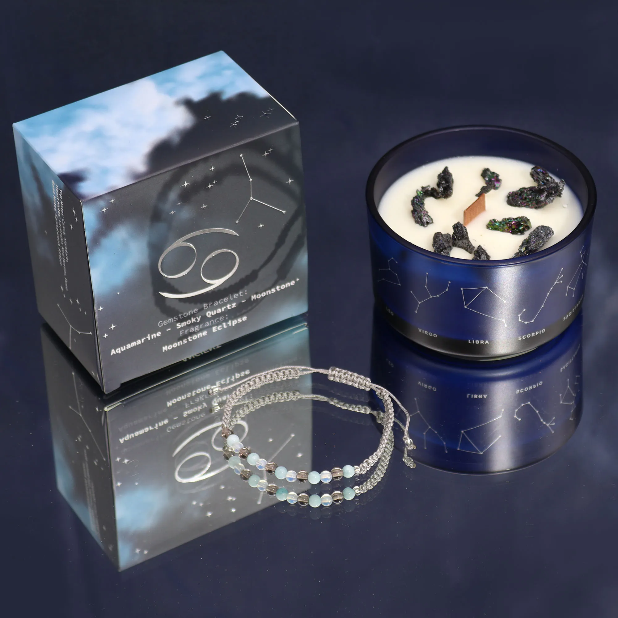 Vähi kristallküünal käevõruga. Sojavahast küünal kuukivi varjutuse aroomiga. Komplektis akvamarini, suitskvartsi ja kuukivi käevõru.