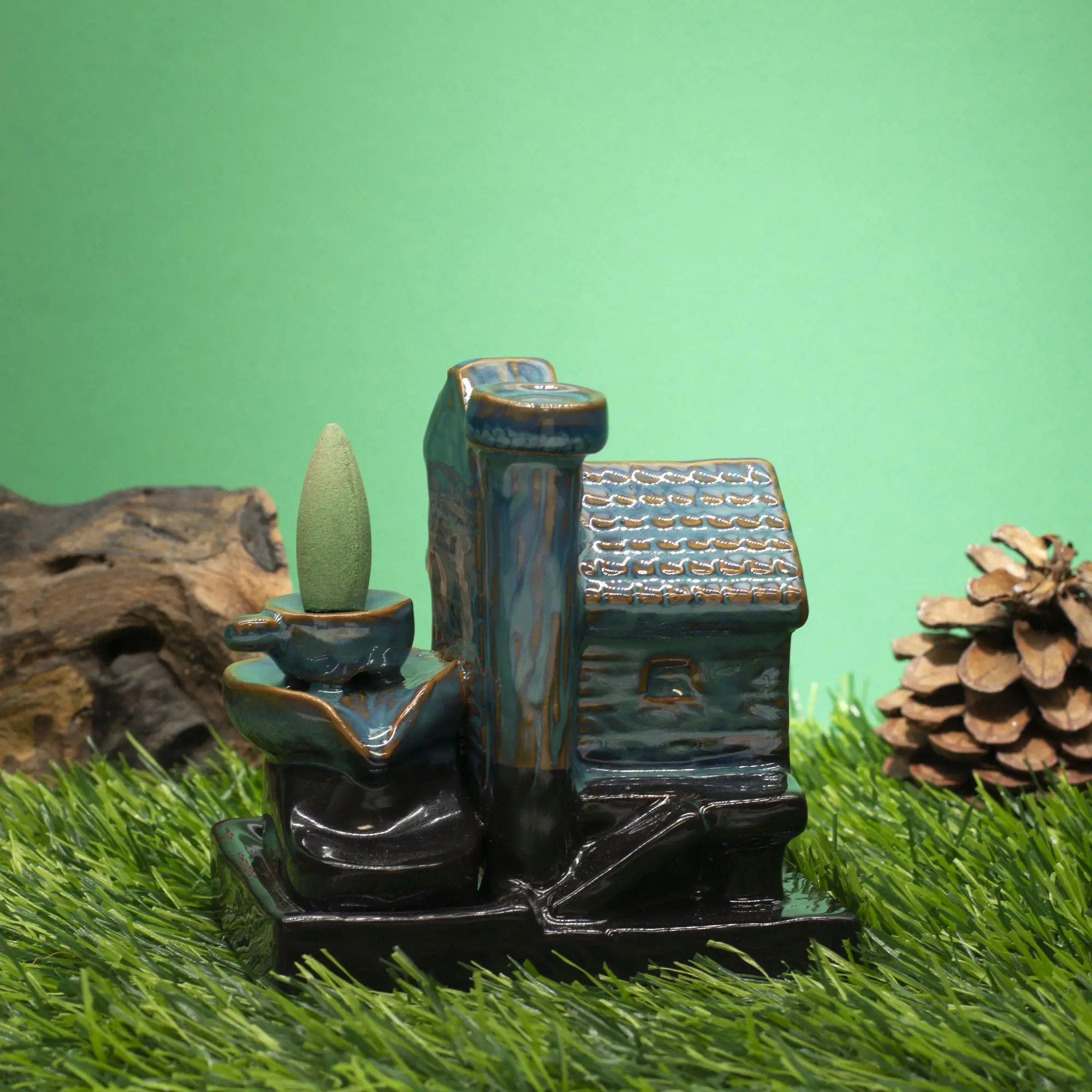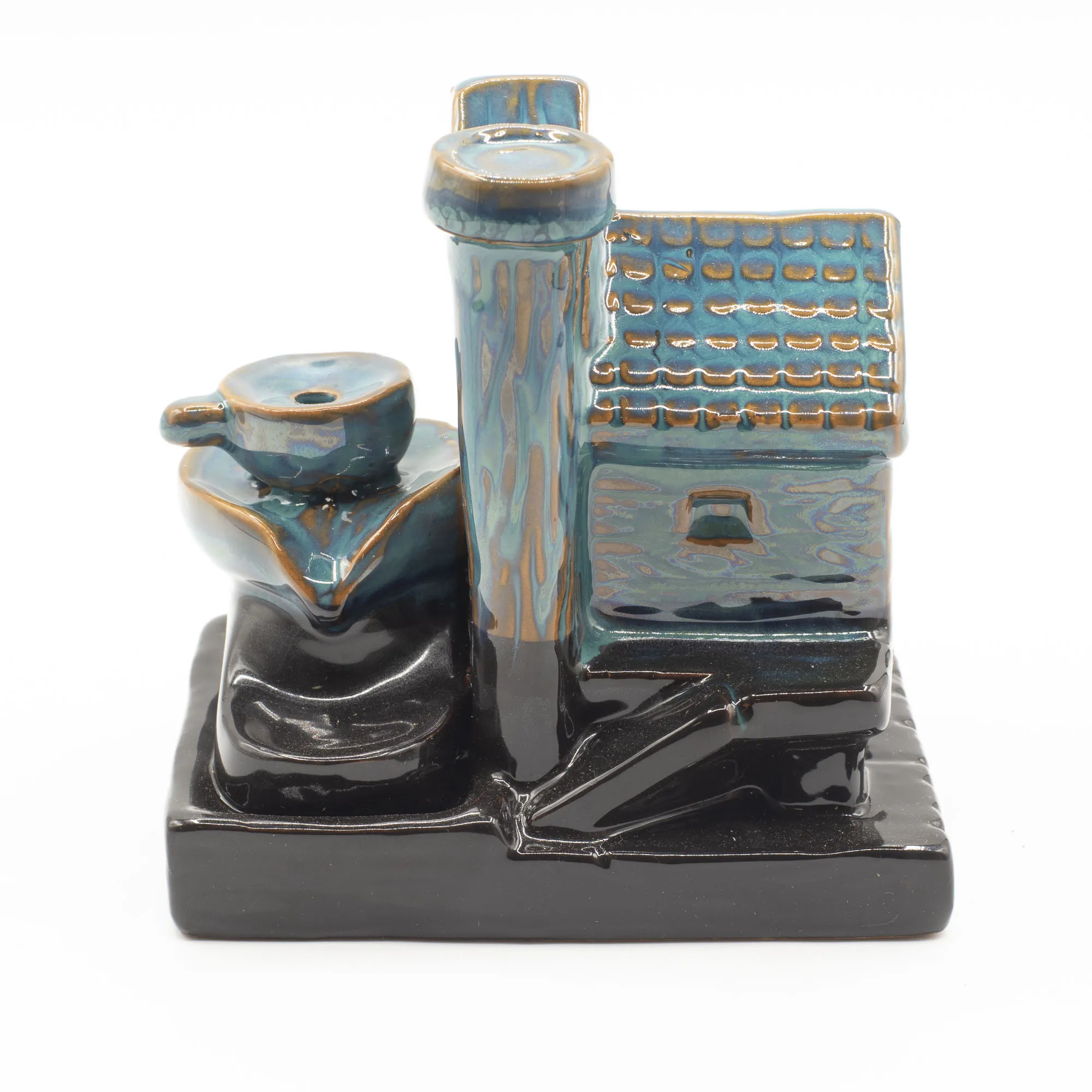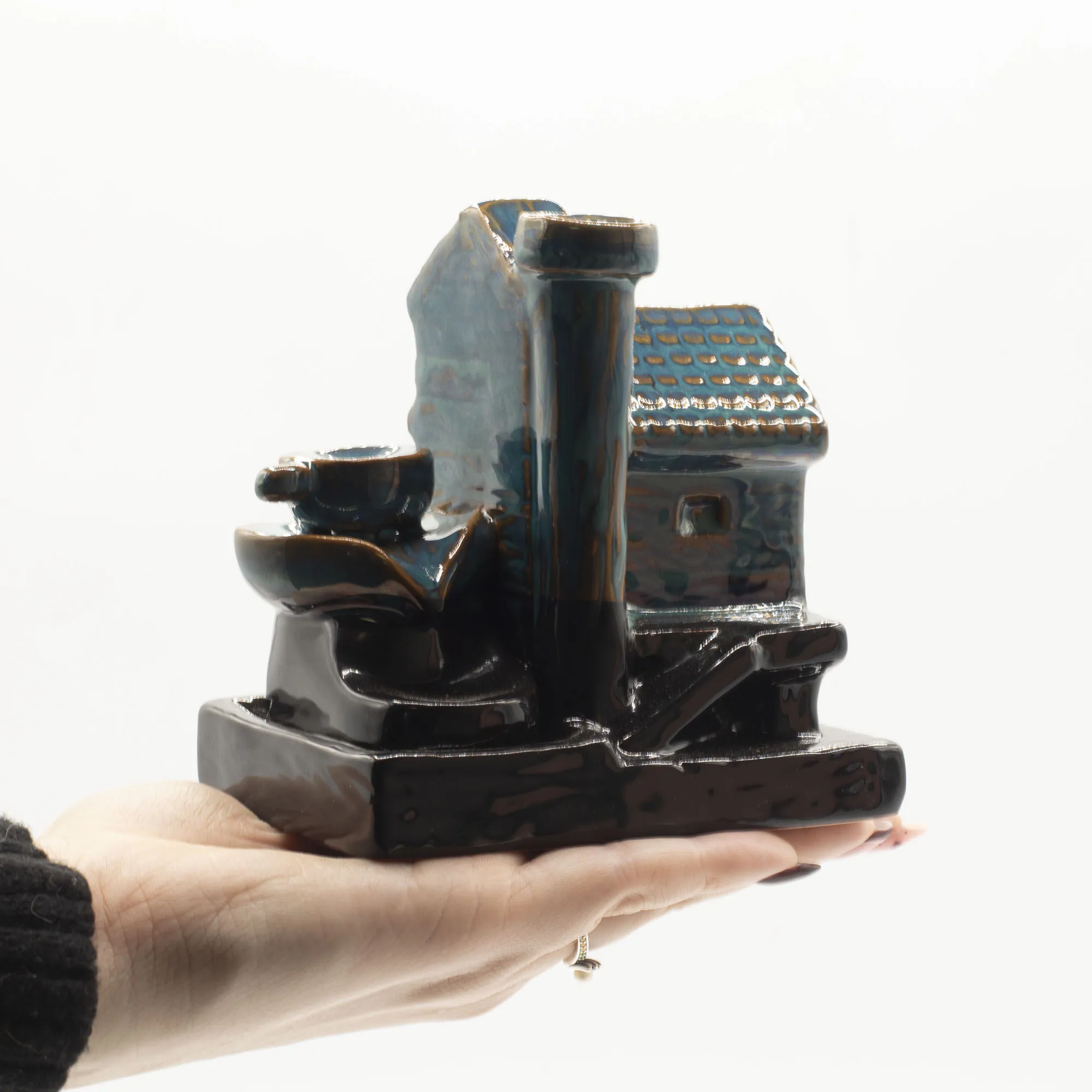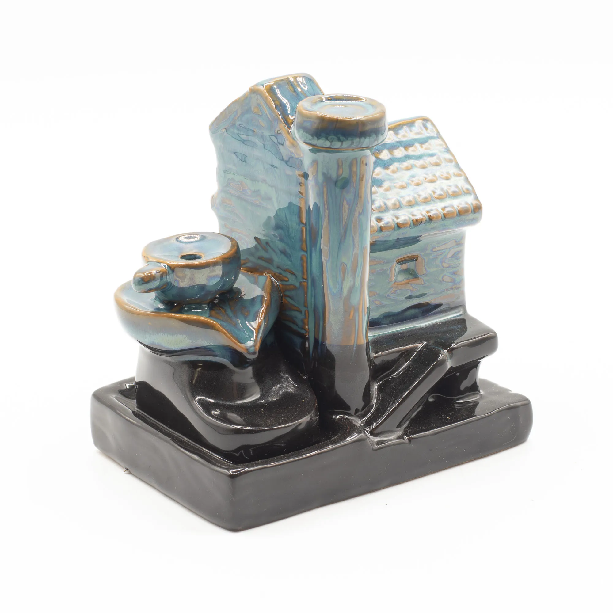 Vesiveski viirukipõleti kujutab detailset vesiveskimaja ja loob rahustava suitsuefekti. Glasuuritud keraamikast backflow põleti koju.